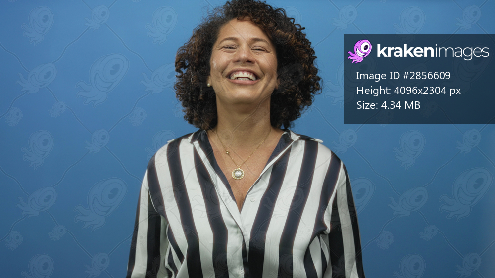 Woman with curly hair wearing striped blouse and gold pendant necklace smiles showing teeth under blue studio lighting; happiness.