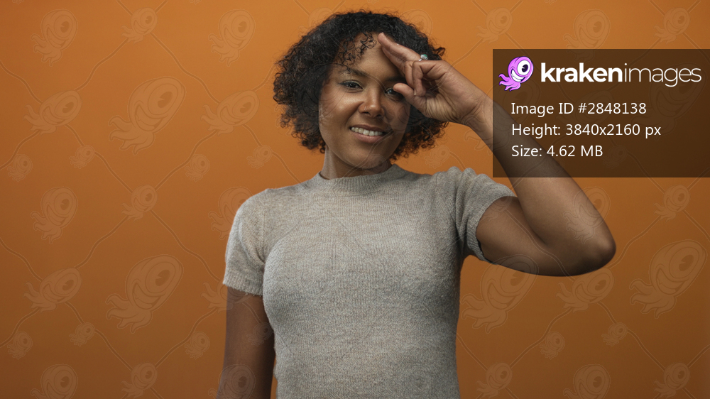 Woman with curly hair wearing turtleneck sweater salutes with hand to forehead in orange studio; optimism confidence warmth welcome.