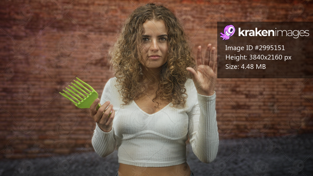 Woman with curly hair wearing white crop sweater holds green wide tooth comb and shrugs palm up against brick wall on street; frustration.