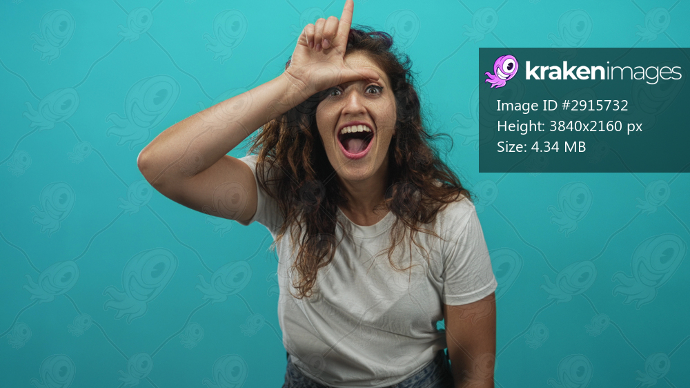 Woman with curly hair wearing white t shirt makes l sign to forehead and laughs in a studio with turquoise wall; playful.