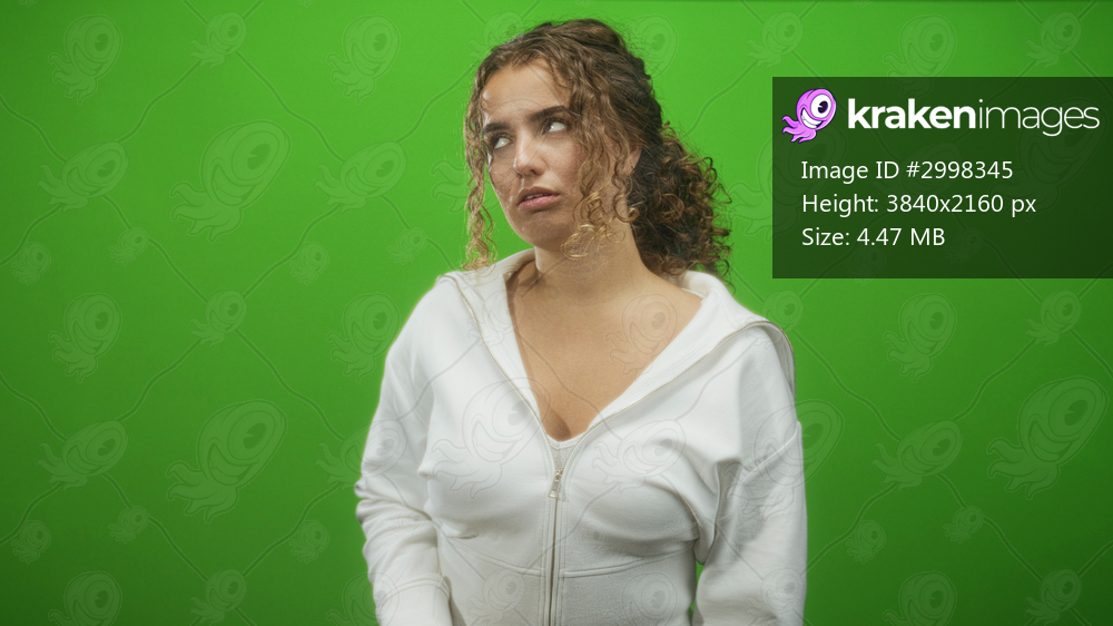 Woman with curly hair wearing white zip hoodie standing against green screen studio, shifting from smile to pout and rolling eyes; annoyance.