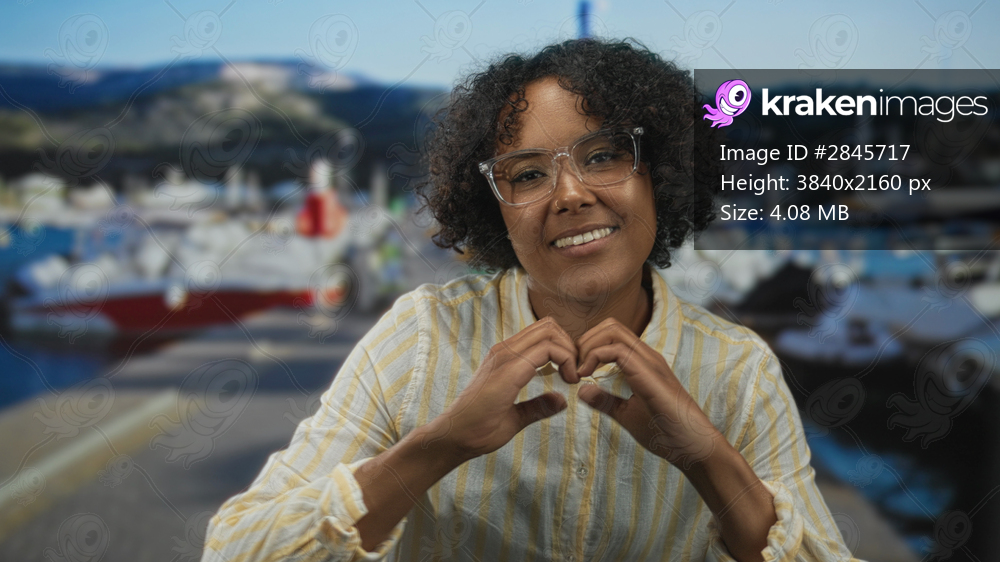 Woman with curly hair wearing yellow striped shirt makes heart shape with hands on street alongside blurred boats; love.
