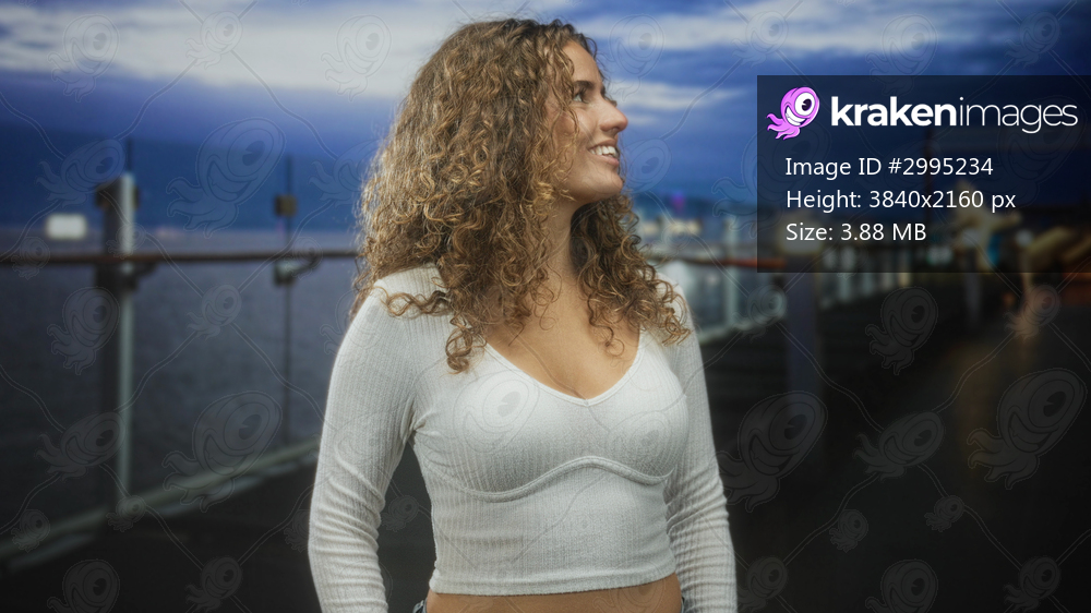 Woman with curly ringlets and visible midriff smiling while looking sideways on a waterfront pier at dusk with glass railings and city lights; serenity. - Kraken Images