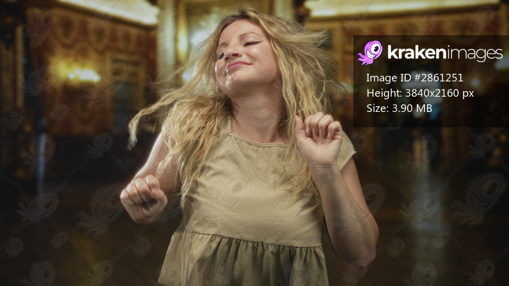 Woman dancing with eyes closed and hands raised in an ornate museum hall lined with chandeliers and gilded columns; joy movement.