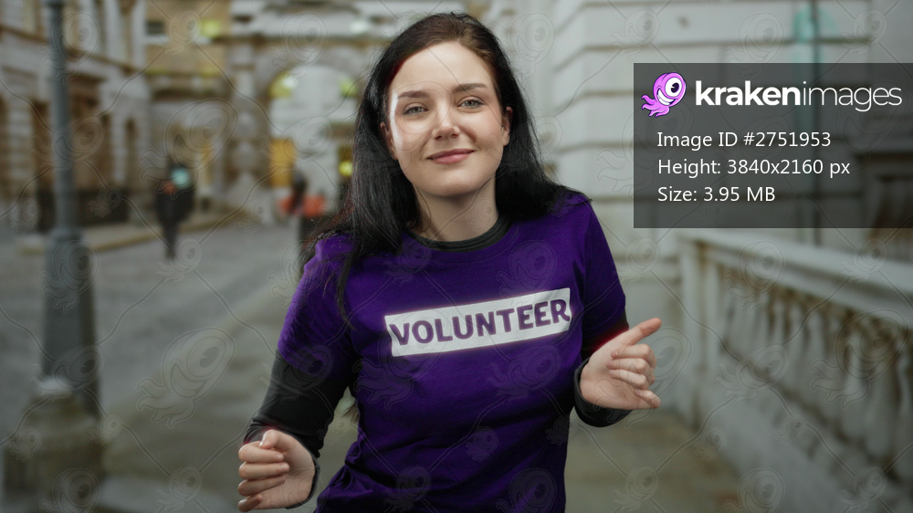 Woman dancing happily in a city street wearing a purple volunteer shirt with a joyful expression in an old town setting.