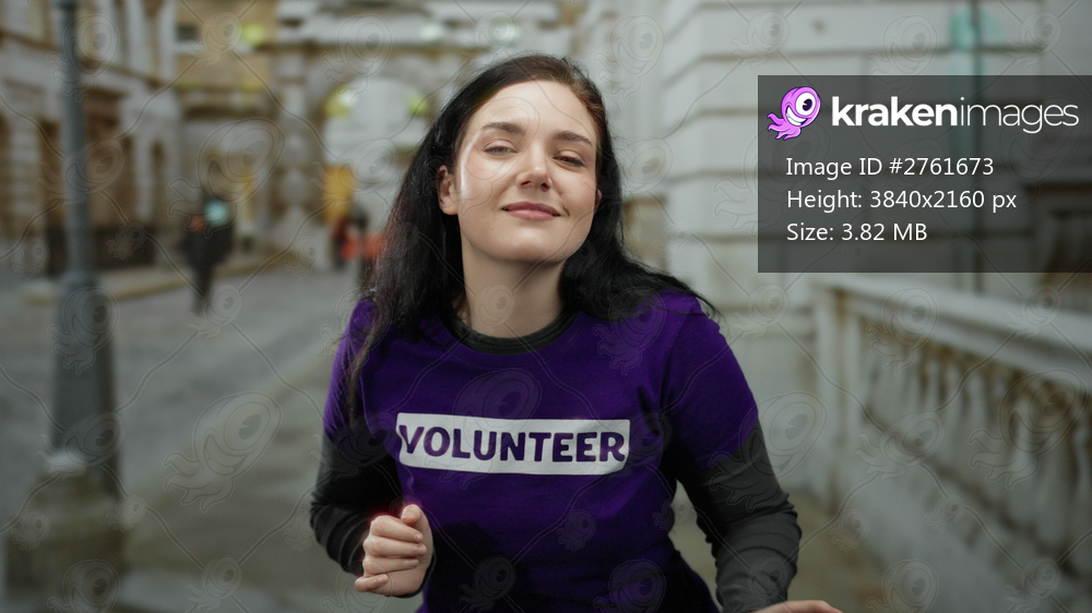 Woman dancing happily in a city street wearing a purple volunteer shirt with a joyful expression in an old town setting.