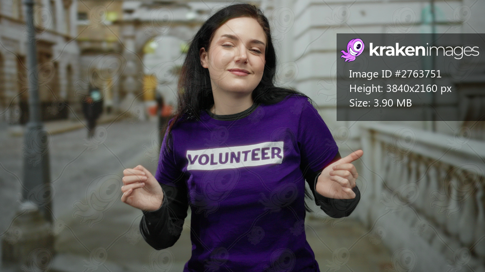 Woman dancing happily in a city street wearing a purple volunteer shirt with a joyful expression in an old town setting.