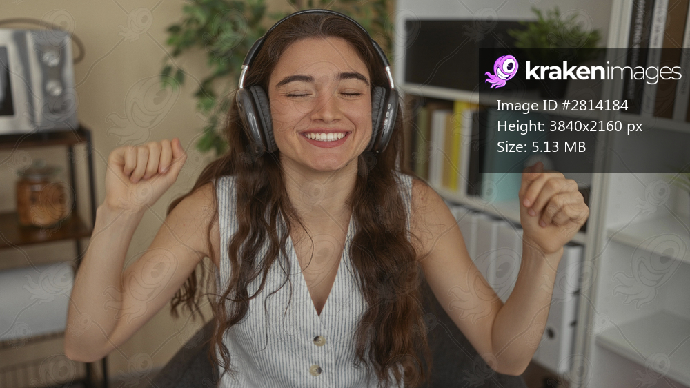 Woman dancing with headphones, raised hands, closed eyes and smiling face at desk among shelves in building; joy.