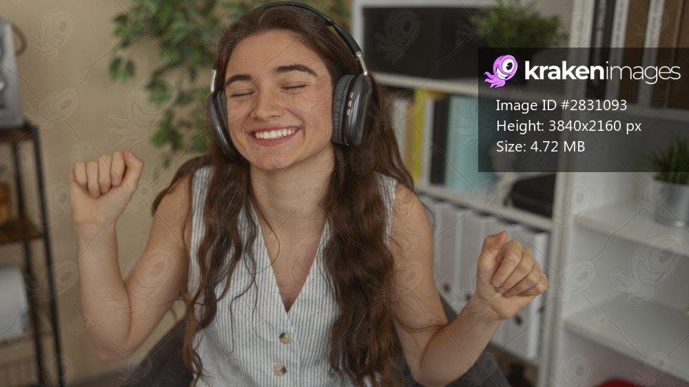 Woman dancing with headphones, raised hands, closed eyes and smiling face at desk among shelves in building; joy.