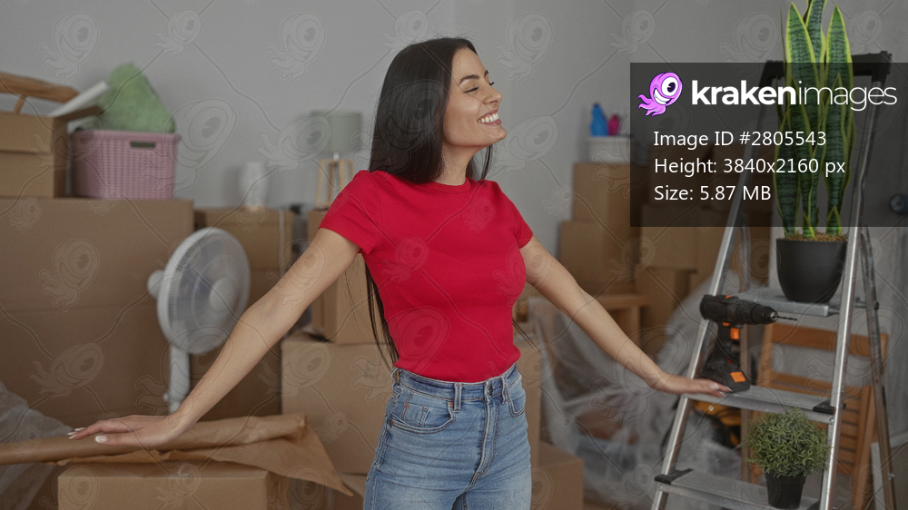 Woman dancing with joy in a new home surrounded by moving boxes and a ladder in a bright living room, signifying excitement and happiness in a fresh start. - Kraken Images