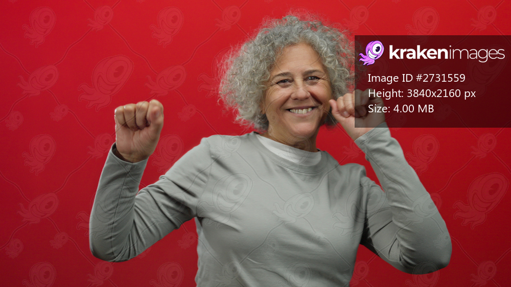 Woman dancing joyfully against a vibrant red wall, showcasing her happiness and confidence with her energetic pose and expressive grey-haired appearance. - Kraken Images