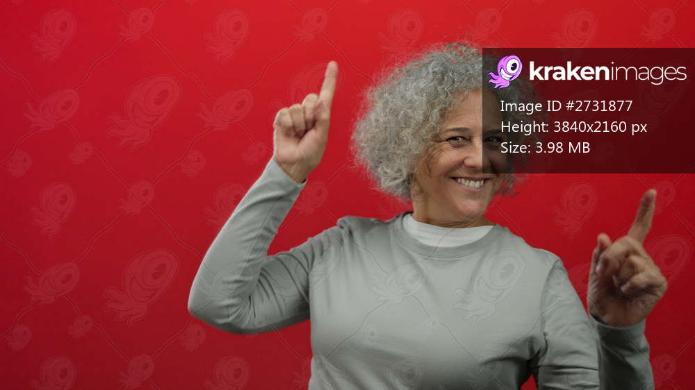 Woman dancing joyfully against a vibrant red wall, showcasing her happiness and confidence with her energetic pose and expressive grey-haired appearance. - Kraken Images