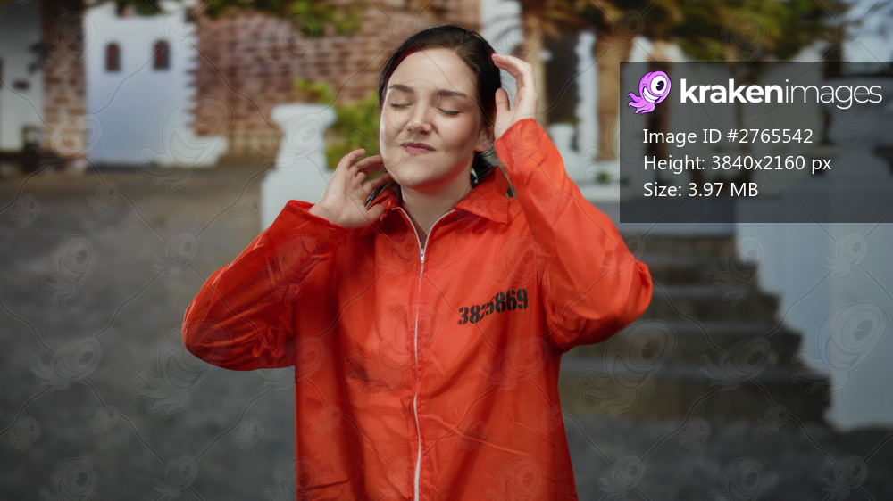 Woman dancing joyfully in an orange prison jumpsuit with eyes closed in a quaint mexican village showcasing traditional architecture.