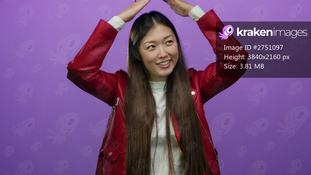 Woman dancing joyously in a red jacket against an isolated purple background, exuding happiness and energy with her raised arms and flowing hair.