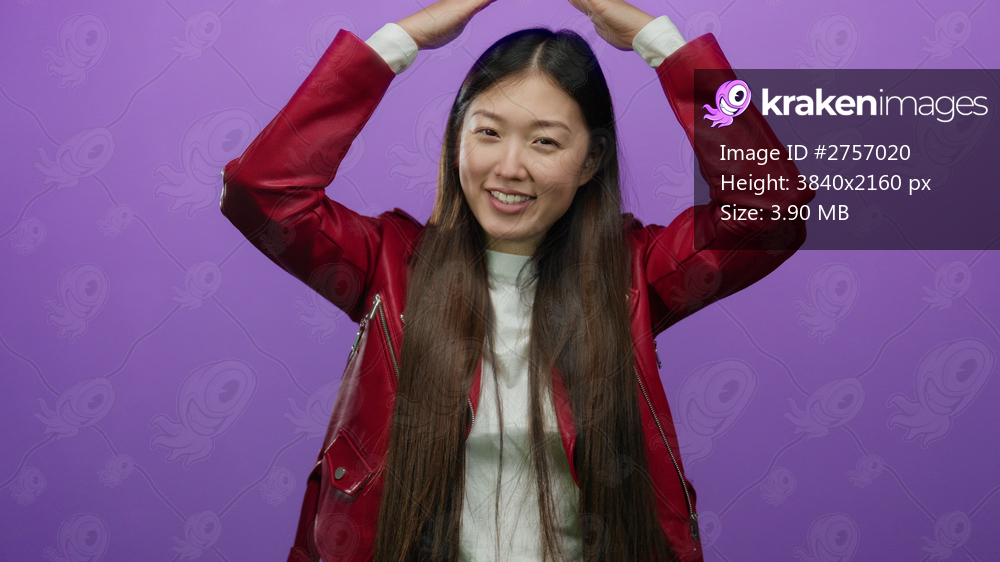 Woman dancing joyously in a red jacket against an isolated purple background, exuding happiness and energy with her raised arms and flowing hair.