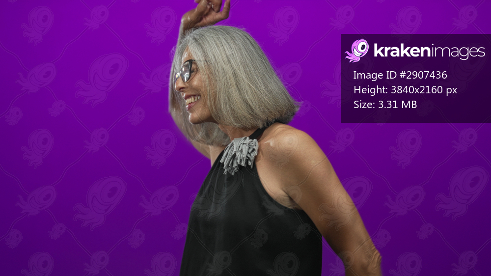 Woman dancing with raised bare arm and smiling face in purple studio, grey hair, glasses, black halter top; joy celebration.