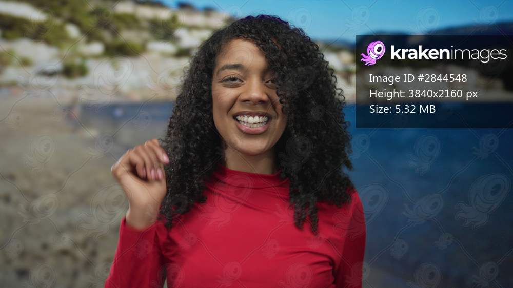 Woman dancing with raised hands and a smiling face on a sandy beach shoreline under a clear blue sky in a red top; joyful freedom.