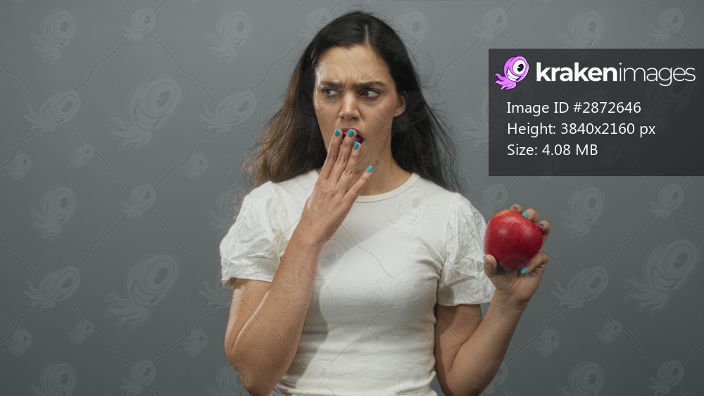 Woman with dark hair holds red apple with hand to mouth in gray studio setting wearing white shirt; disgust.