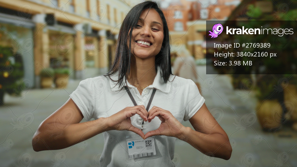Woman with dark hair smiles while making a heart symbol with her hands on a vibrant street backdrop, exuding joy and connection in a lively urban environment. - Kraken Images