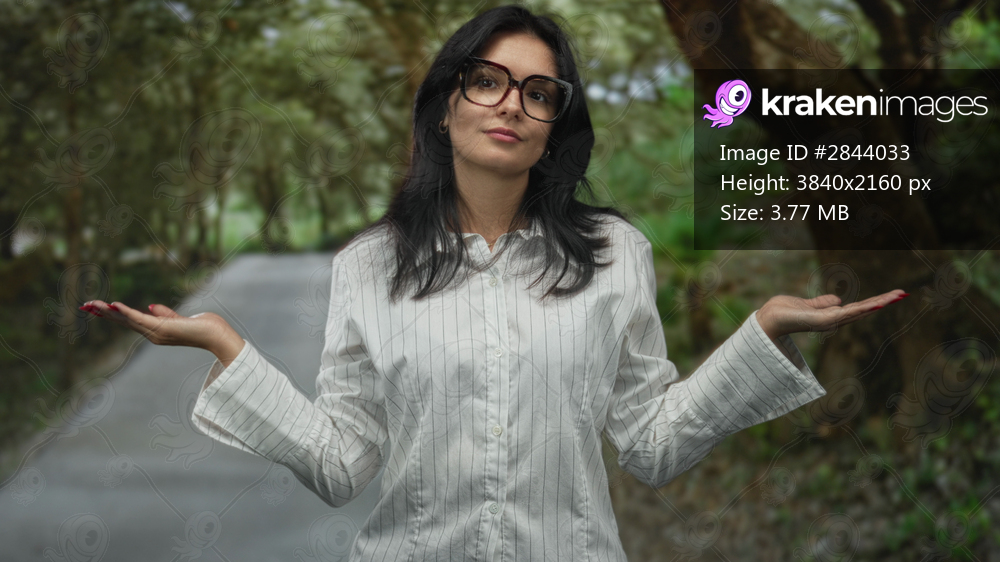 Woman with dark hair wearing oversized glasses and white shirt holds hands out on forest path; uncertainty.