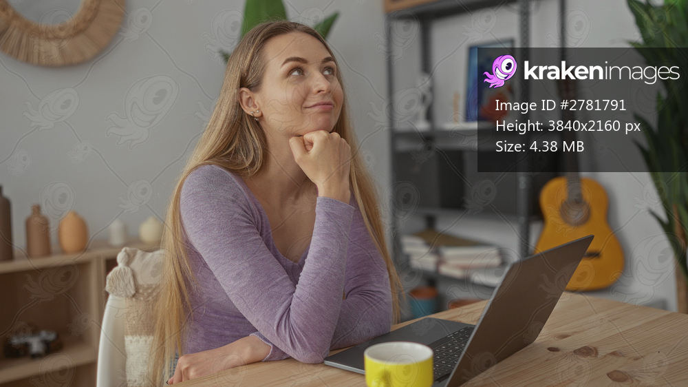 Woman daydreaming in a cozy living room with laptop, surrounded by plants and home decor, wearing purple shirt, exuding a relaxed and thoughtful vibe at a wooden table with guitar nearby. - Kraken Images