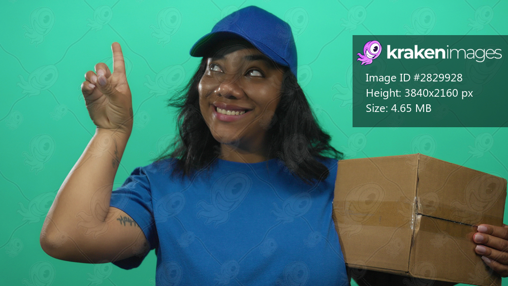 Woman delivery courier smiles and holds cardboard box while pointing finger upward in studio; optimism.