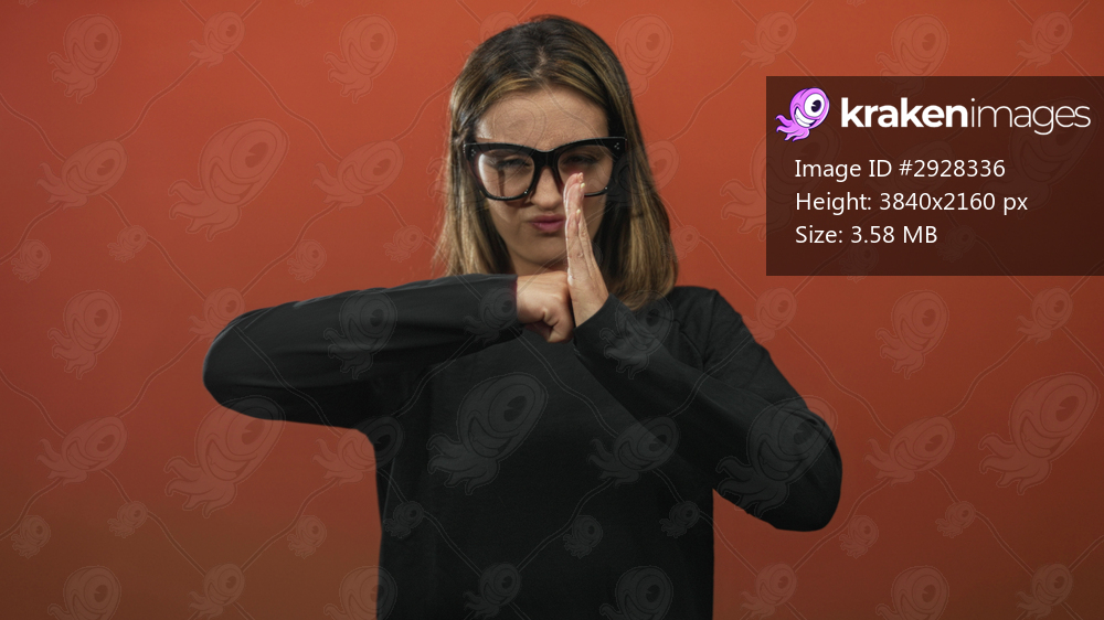 Woman demonstrating alternating punch and palm block with hands in studio against orange wall; determination.