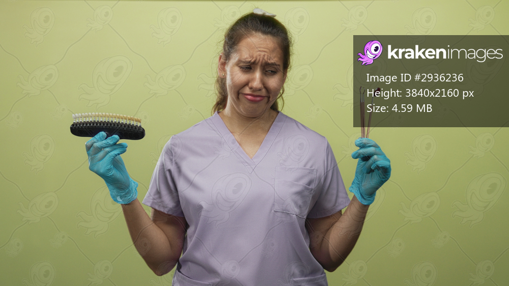 Woman dentist holding a tooth shade guide and dental mirror, wearing blue gloves in studio with light green background; confidence care.