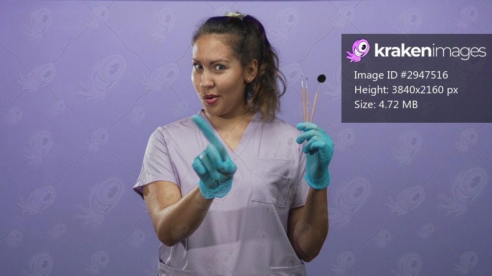 Woman dentist holding dental instruments and covering mouth with gloved hand in studio; surprise uncertainty.
