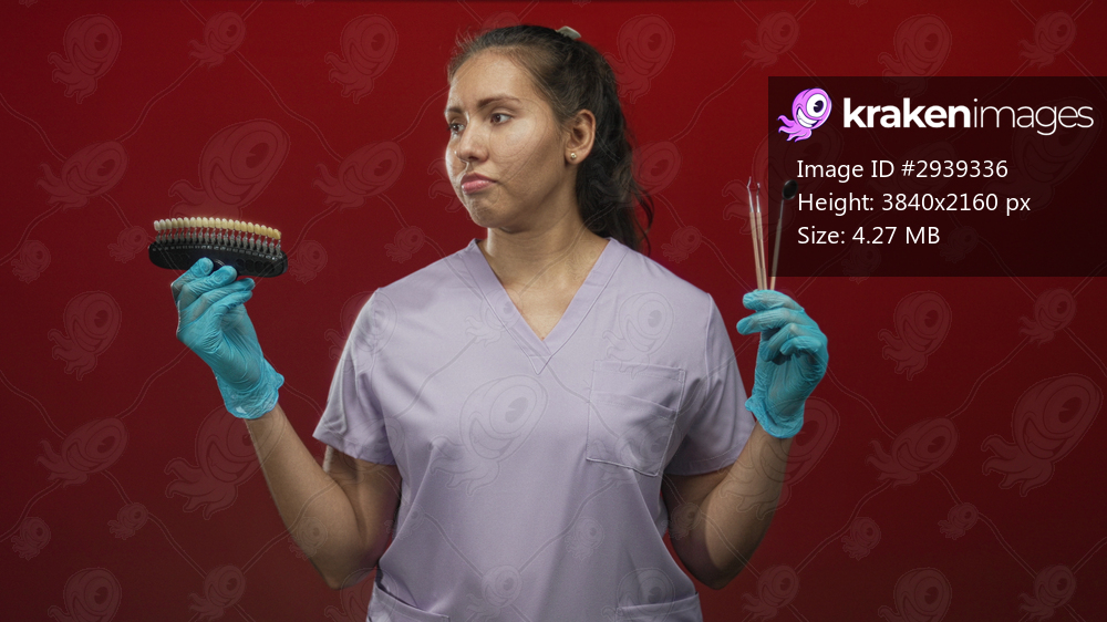 Woman dentist holding dental shade guide and instruments in a red studio wearing lilac scrubs and blue gloves; hesitation.