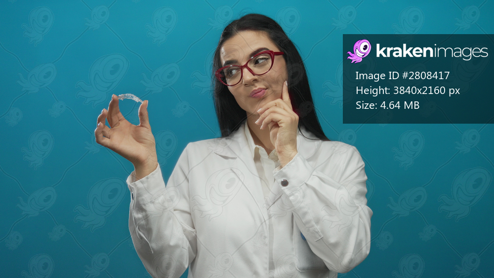Woman dentist holding invisible braces confidently against a blue wall background, showcasing modern dental technology with a professional and focused expression. - Kraken Images