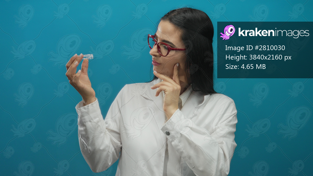 Woman dentist holding invisible braces confidently against a blue wall background, showcasing modern dental technology with a professional and focused expression. - Kraken Images
