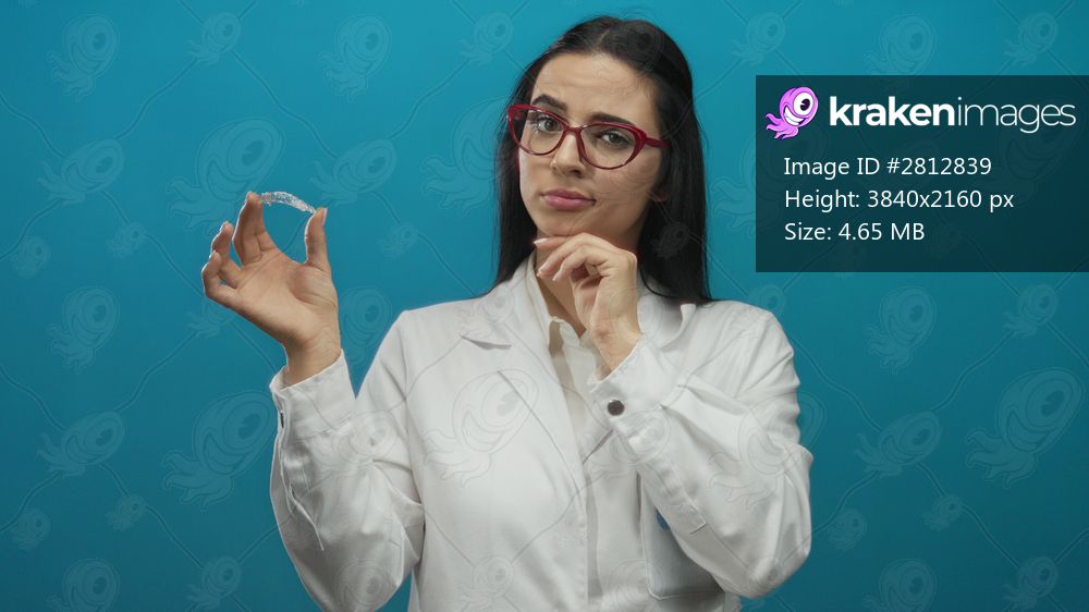 Woman dentist holding invisible braces confidently against a blue wall background, showcasing modern dental technology with a professional and focused expression. - Kraken Images