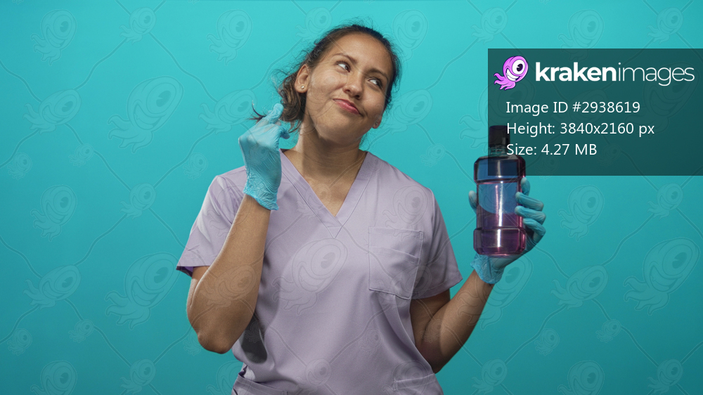 Woman dentist holding mouthwash bottle and hand on cheek indicating toothache in teal studio; playful dental care.