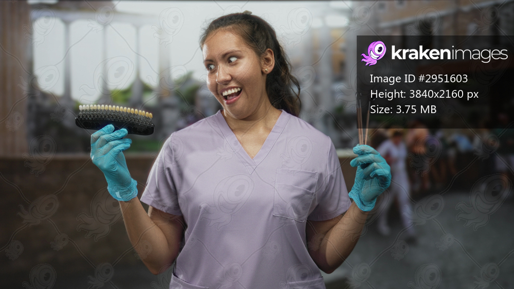 Woman dentist holding shade guide and dental mirror at ancient ruins building; playful dental care travel.
