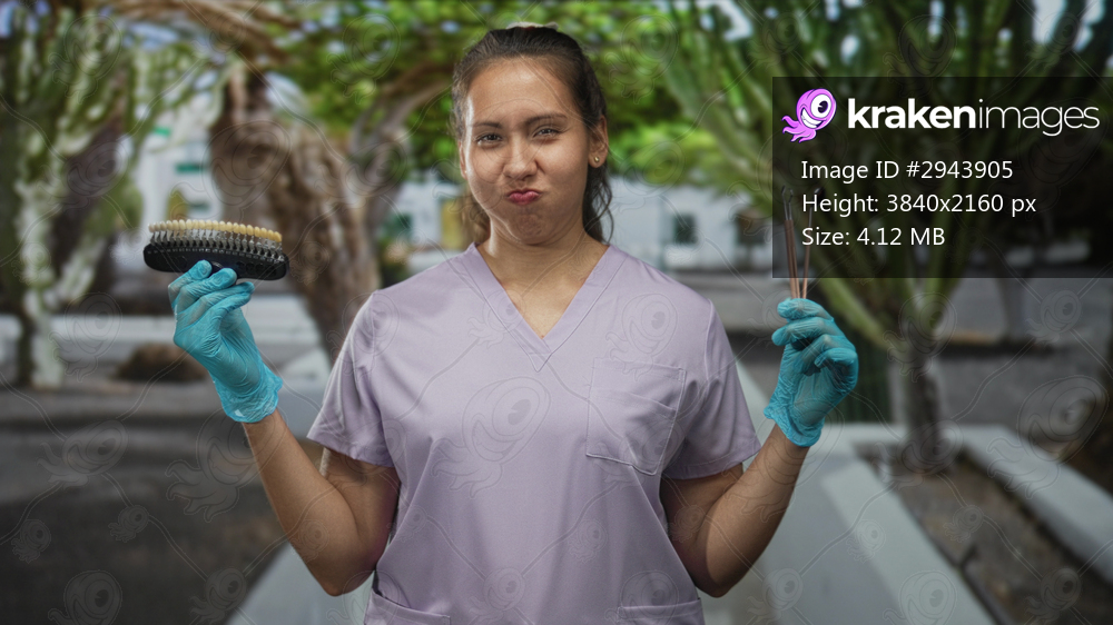 Woman dentist in lavender scrubs holds dental shade and mirror with gloved hands on street outside building; patient care confidence.