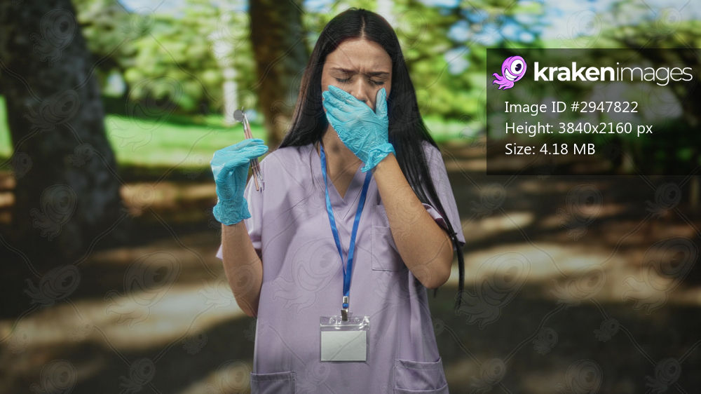 Woman dentist in scrubs with badge holds dental mirror and probe with gloved hand while touching chest in a forest; toothache discomfort.