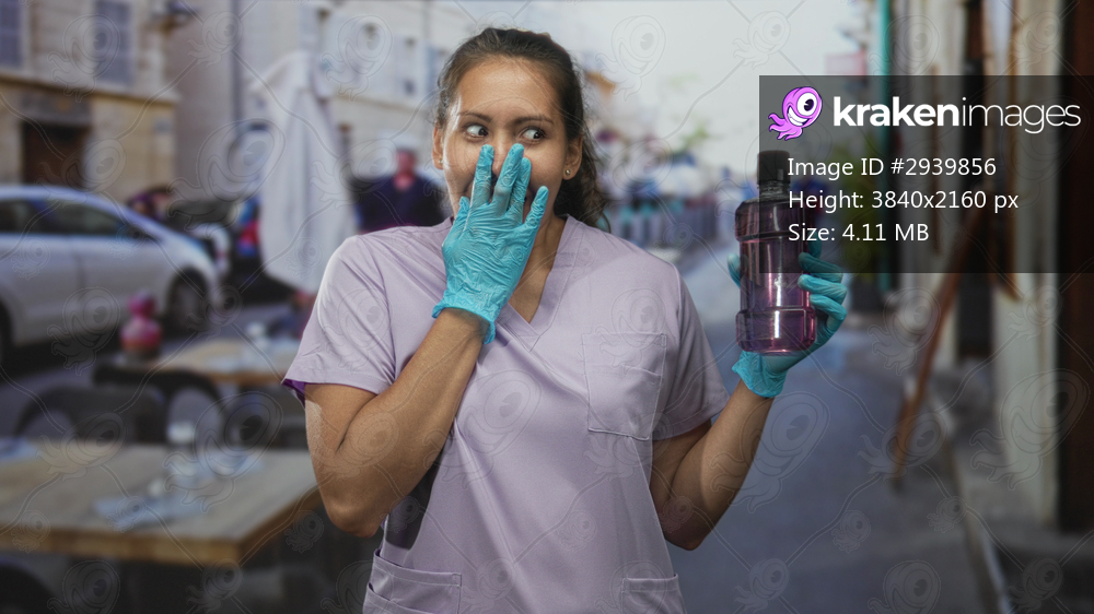 Woman dentist in scrubs holding a purple bottle with gloved hand and hand to mouth on street restaurant terrace outdoors, inspecting bottle; surprise.