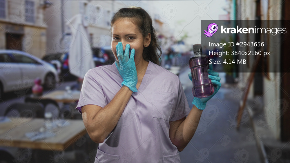 Woman dentist in scrubs holding a purple bottle with gloved hand and hand to mouth on street restaurant terrace outdoors, inspecting bottle; surprise.