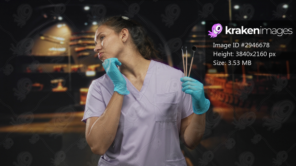 Woman dentist in scrubs holding dental mirror and explorer while gloved hand touches chin in museum building; concern dental care.