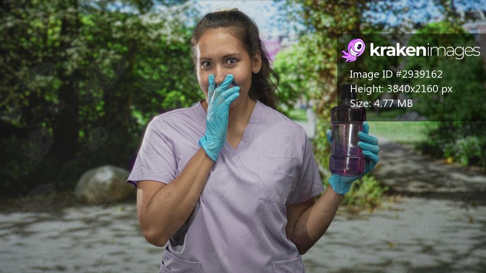 Woman dentist in scrubs holding purple mouthwash bottle, gloved hand to mouth on street; dental care surprise.