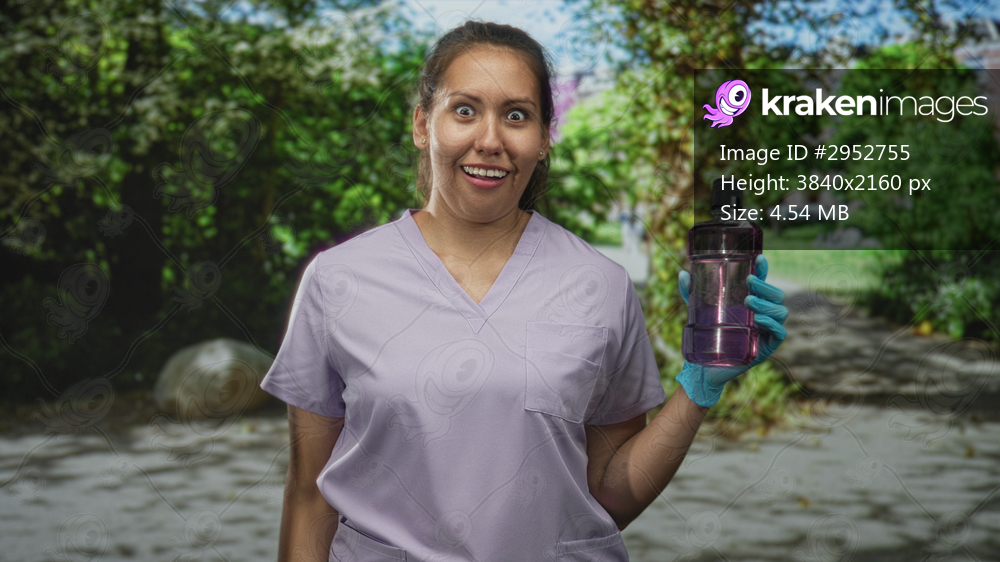 Woman dentist in scrubs holding purple mouthwash bottle, gloved hand to mouth on street; dental care surprise.