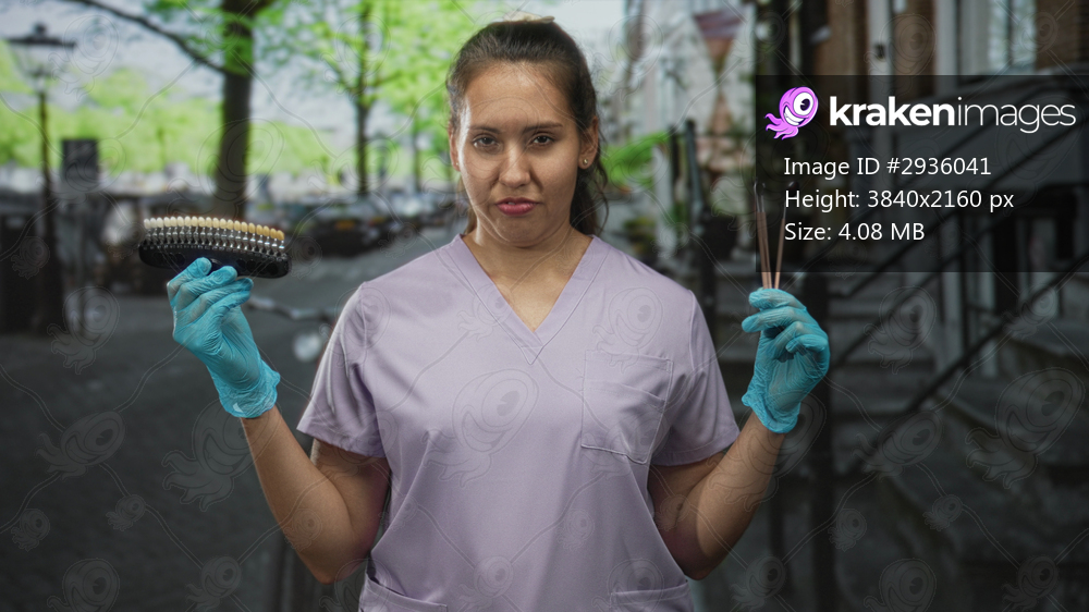 Woman dentist in scrubs holds dental shade guide and probes with gloved hands on a city street; contemplation.
