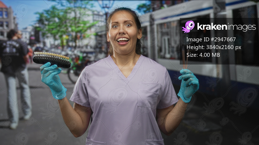 Woman dentist wearing lavender scrubs and nitrile gloves holding dental shade guide and probes on a crowded city street; playful choice.