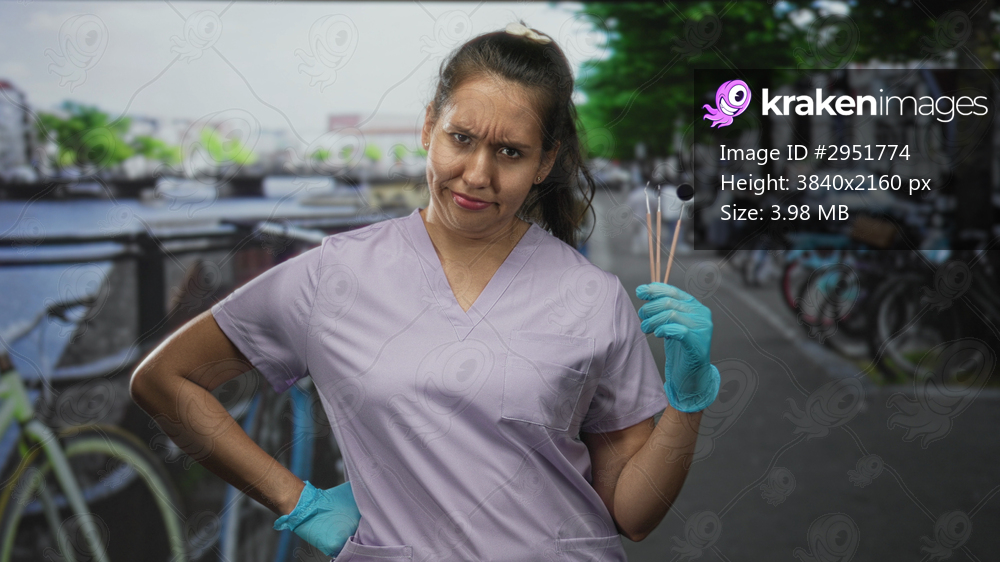 Woman dentist wearing scrub top and gloves holding dental mirror and explorer tools with gloved hand, arm akimbo on street;professional doubt annoyance. - Kraken Images