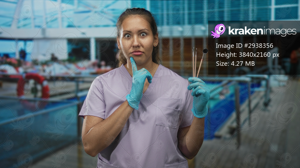 Woman dentist wearing scrubs and blue gloves holding dental mirror and probes, finger to chin in building pool area; thoughtful.
