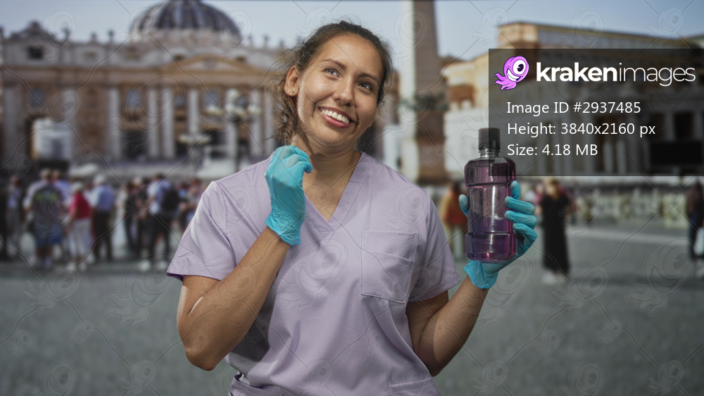 Woman dentist wearing scrubs and gloves holding mouthwash bottle and touching cheek for toothache in vatican square; dental care compassion.