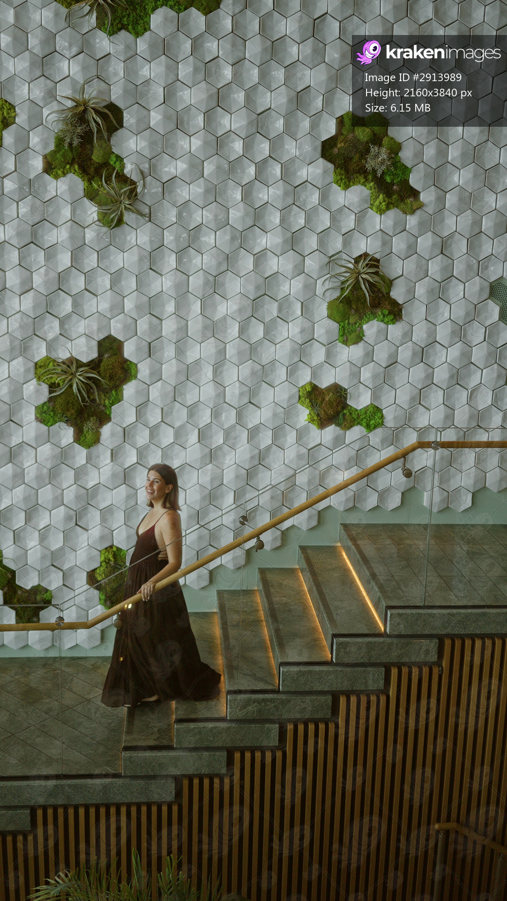Woman descending stairs holding railing in hotel building with hex tile living wall and potted plants; serene confidence.