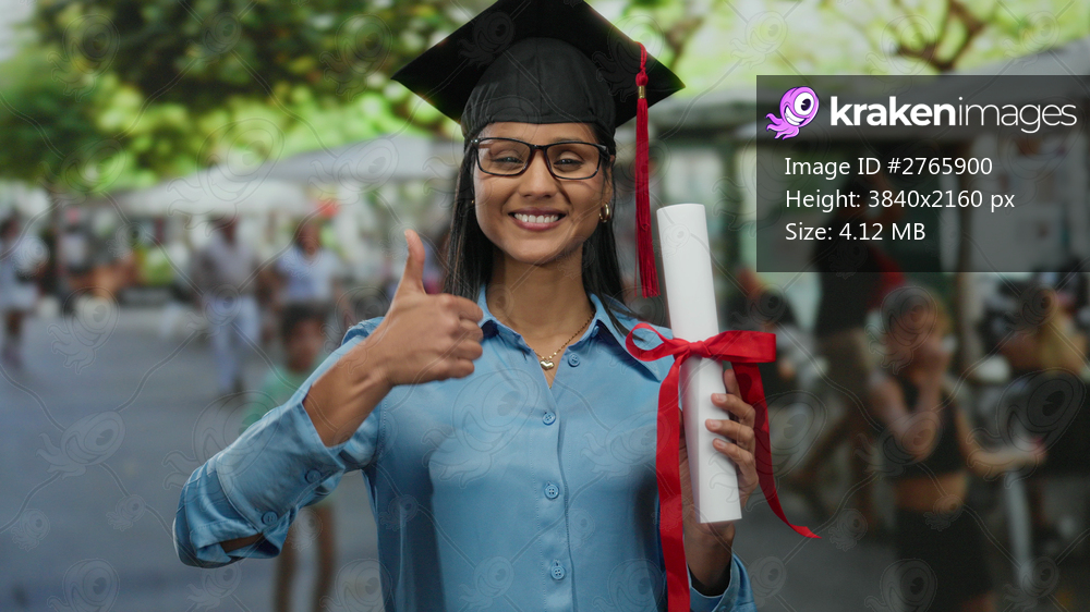 Woman with diploma wearing glasses and graduation cap gives thumbs up on urban outdoor terrace.