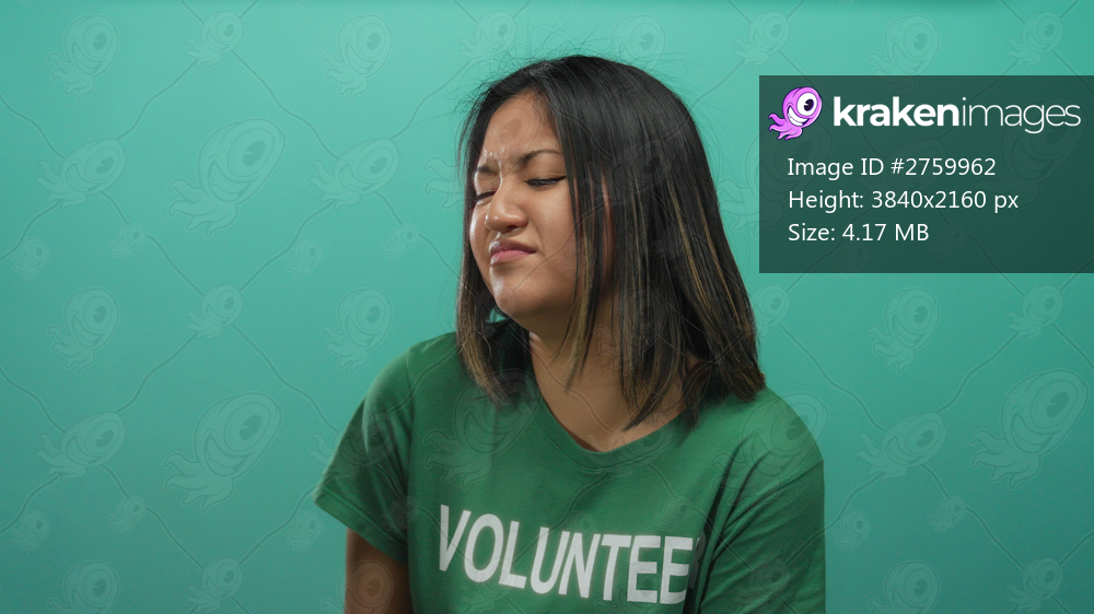 Woman with disgusted expression in green volunteer t-shirt against an isolated green wall background showcasing emotion and voluntary concepts.